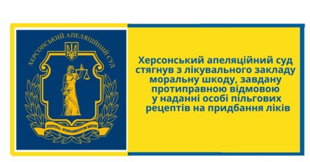 Перевіривши законність та обґрунтованість рішення суду першої інстанції в межах доводів апеляційної скарги, колегія суддів Херсонського апеляційного суду, враховуючи вимоги розумності, виваженості та справедливості, характер протиправних дій лікувального закладу, оцінюючи характер та обсяг страждань, яких зазнала позивачка у зв`язку з відмовою відповідача у видачі пільгових рецептів на придбання необхідних їй лікарських засобів, які вона вимушена була придбати за власні кошти задля підтримання життєво важливих показників свого здоров`я, дійшла висновку про можливість часткового задоволення позовних вимог та стягнення з відповідача на її користь 1000,00 грн. моральної шкоди.