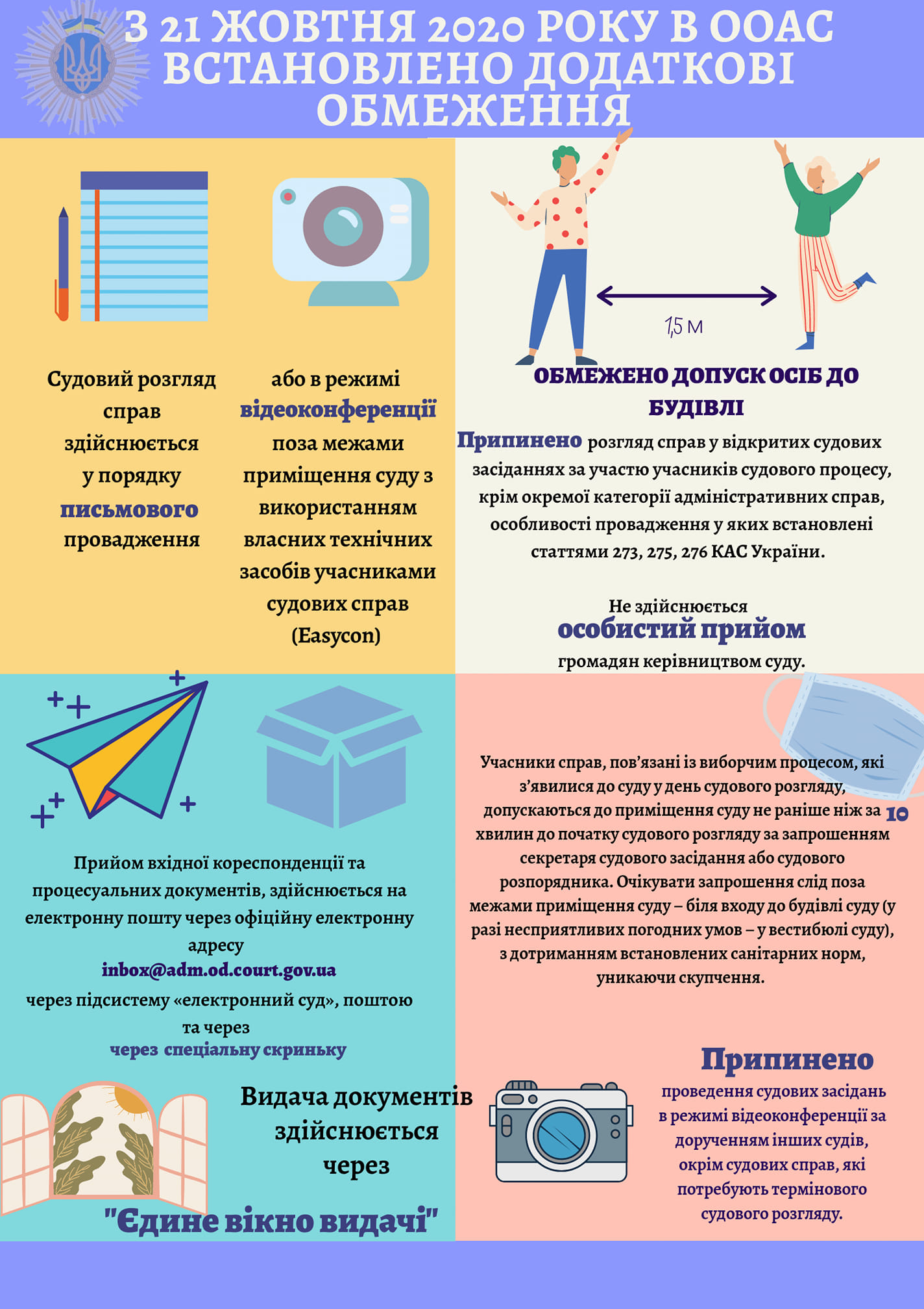 Повідомляємо, що наказом голови Одеського окружного адміністративного суду від 20.10.2020 № 22 ОС/Д/С з метою запобігання, виникнення і поширення коронавірусної хвороби (СОVІD-19) з 21 жовтня 2020 року на період запровадження в Україні карантинних заходів в ООАС встановлені додаткові обмеження: