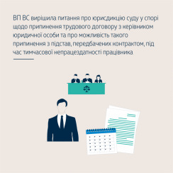 Розглянувши питання щодо можливості припинення трудового договору з підстав, передбачених контрактом, під час тимчасової непрацездатності працівника, Велика Палата ВС вирішила відступити від висновків Верховного Суду України, викладених у постановах від 26 грудня 2012 року у справі № 6-156цс12 і від 23 січня 2013 року у справі № 6-127цс12. Відповідно до цих висновків припис ч. 3 ст. 40 КЗпП України (не допускається звільнення працівника з ініціативи власника або уповноваженого ним органу в період його тимчасової непрацездатності (крім звільнення за п. 5 ст. 40 КЗпП України), а також у період перебування працівника у відпустці) поширюється на випадки звільнення працівника з ініціативи власника або уповноваженого ним органу, тоді як припинення трудового договору з працівником із підстав, передбачених контрактом (за п. 8 ч. 1 ст. 36 КЗпП України), не є звільненням з такої ініціативи, тому на працівника, звільненого за вказаною підставою, не поширюється гарантія, передбачена ч. 3 ст. 40 КЗпП України.