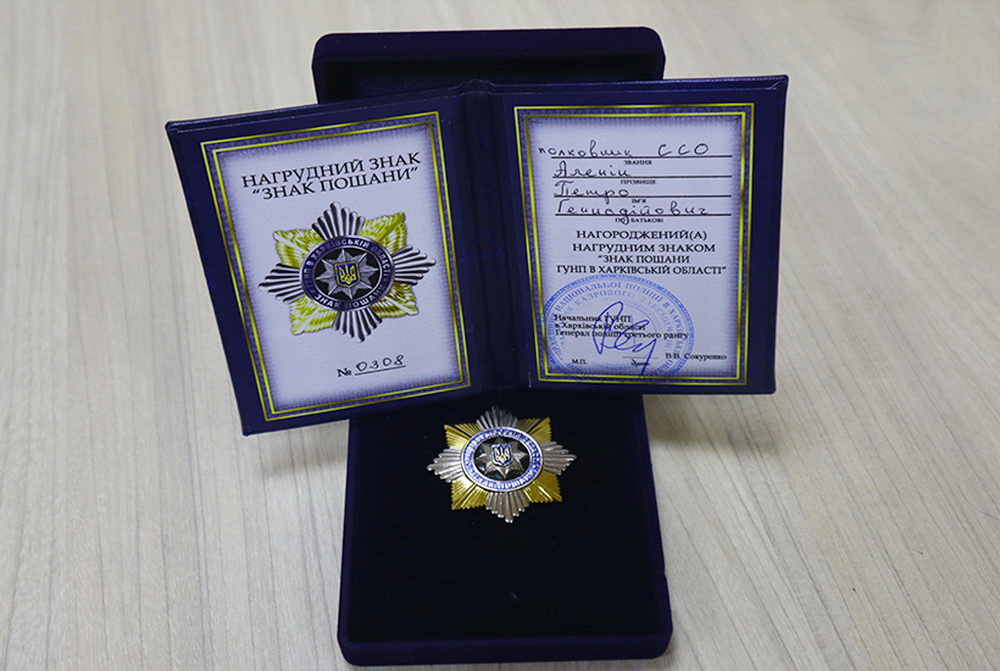 Довідково. Нагрудним знаком “Знак пошани” нагороджуються поліцейські, державні службовці, працівники органів (підрозділів) поліції за особисту мужність, героїзм і відвагу, які з ризиком для свого життя врятували життя іншому громадянину.