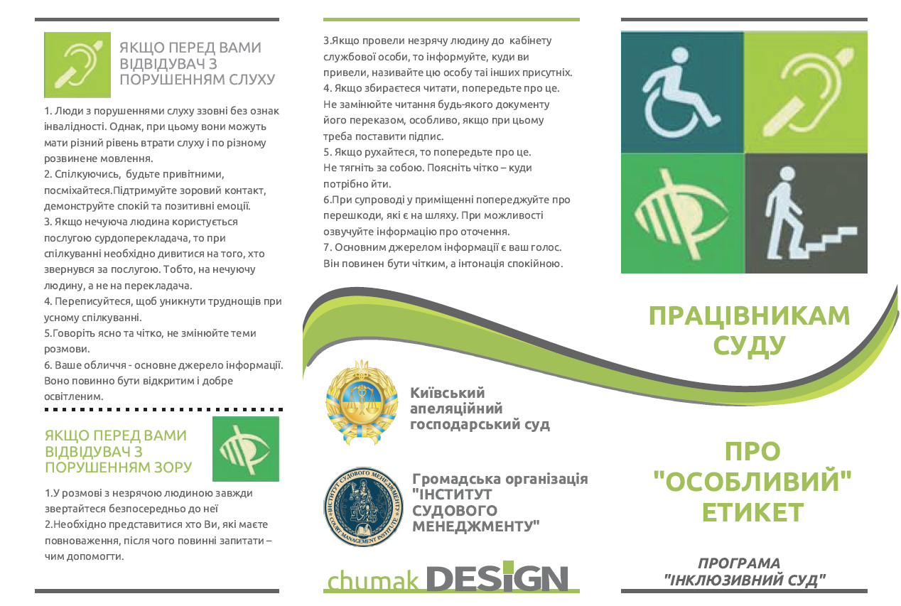 Щоб домогти працівникам судів краще розуміти особливості спількування з особами, які мають різні види порушень, розроблено та видано спеціальний буклет: ПРАЦІВНИКАМ СУДУ ПРО ОСОБЛИВИЙ ЕТИКЕТ