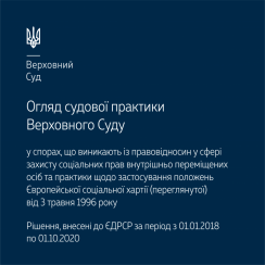 Пропонуємо ознайомитися з Оглядом судової практики Верховного Суду у спорах, що виникають із правовідносин у сфері захисту соціальних прав внутрішньо переміщених осіб та практики щодо застосування положень Європейської соціальної хартії (переглянутої) від 3 травня 1996 року.