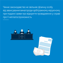 Законодавцем установлено спосіб врегулювання неплатоспроможності фізичної особи виключно за заявою боржника. При цьому Законом України «Про судовий збір» не передбачено сплати судового збору за подання заяви фізичною особою про порушення справи про банкрутство. Тож держава виконує свій позитивний обов’язок щодо забезпечення доступу неплатоспроможних фізичних осіб до правосуддя у справах про банкрутство, не встановлюючи для таких фізичних осіб ставок судового збору за звернення із заявою про відкриття провадження у справі про банкрутство. Водночас законодавцем не передбачено жодних альтернативних можливостей авансування на депозитний рахунок суду оплати послуг керуючого реструктуризацією за три місяці виконання ним повноважень, що є гарантією з боку держави оплати праці цією особи на час формування реєстру вимог кредиторів у справі про банкрутство та відповідає положенням частин 2, 6 ст. 43 Конституції України.