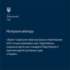 На сайті Верховного Суду розміщено матеріали вебінару «Захист соціальних прав внутрішньо переміщених осіб та інших вразливих груп: Європейська соціальна хартія, інші стандарти Ради Європи й практика адміністративних судів в Україні», який в онлайн-режимі відбувся 25 листопада 2020 року.