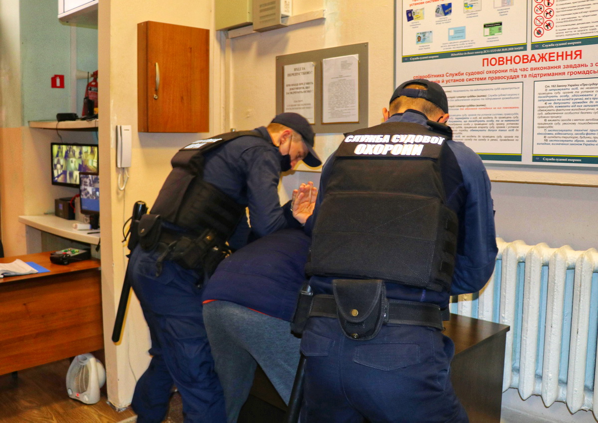 Потім співробітники Територіального управління Служби судової охорони у Закарпатській області разом із правоохоронцями відпрацьовували тактику дій під час супроводу осіб, що перебувають під вартою, у разі масових порушень громадського порядку в залі судових засідань.