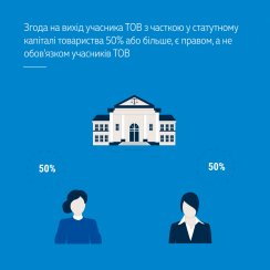 З аналізу частин 2–5 ст. 24 Закону України «Про товариства з обмеженою та додатковою відповідальністю» та ч. 5 ст. 17 Закону України «Про державну реєстрацію юридичних осіб, фізичних осіб – підприємців та громадських формувань» вбачається, що у випадку, якщо частка у статутному капіталі товариства становить 50 або більше відсотків, учасник може вийти з товариства лише за згодою інших учасників. Зокрема, для здійснення державної реєстрації змін до відомостей про юридичну особу у випадку виходу одного з учасників товариства, якому належить 50 і більше відсотків, іншим учасникам необхідно надати згоду на вихід, справжність підписів на якій повинна засвідчуватися нотаріально.