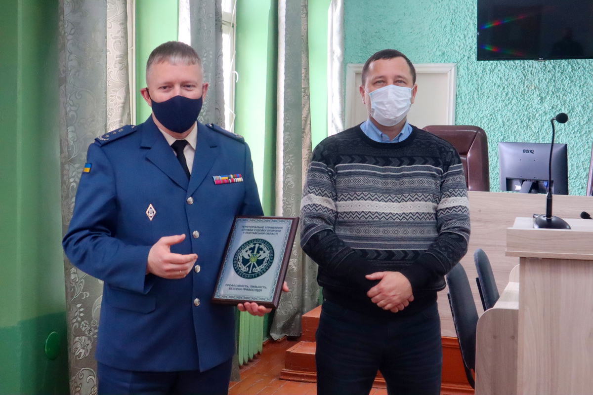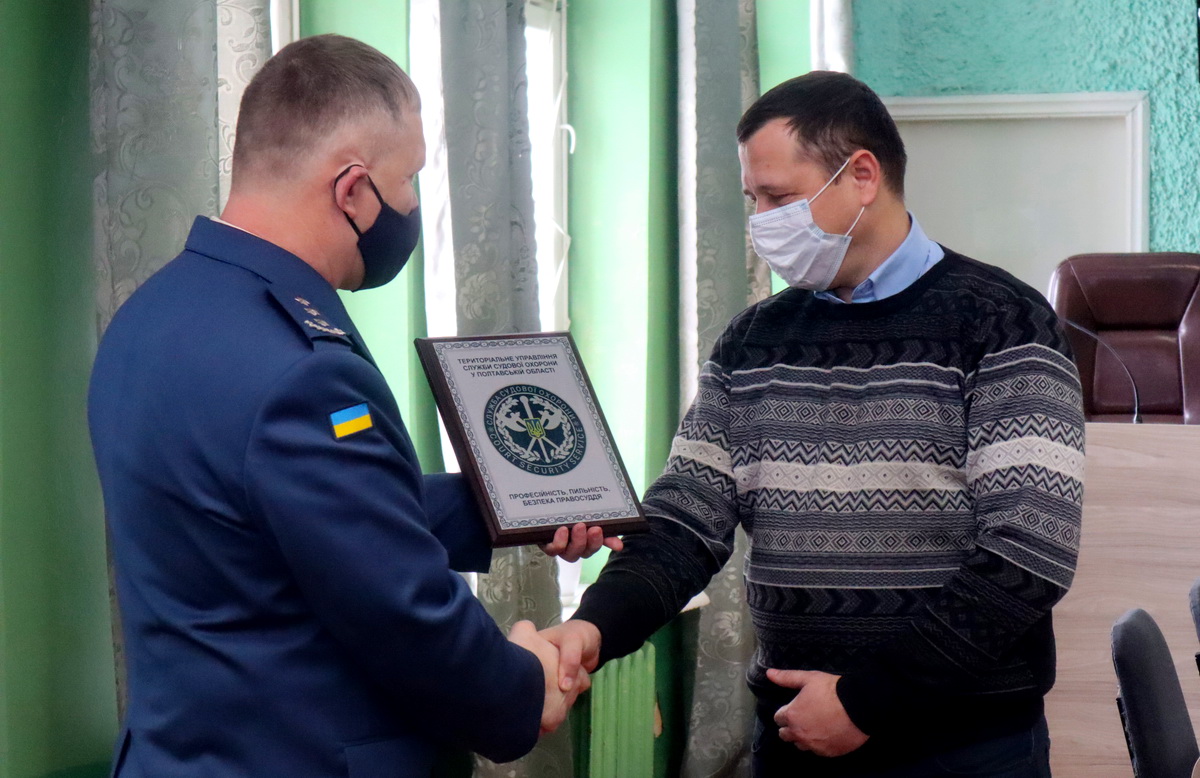 Начальник Територіального управління Служби судової охорони у Полтавській області полковник Служби судової охорони Олександр Аленін представив голові суду Юрію Ячалу та колективові установи співробітників Служби, які відсьогодні забезпечуватимуть охорону та безпеку суду.