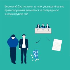 ККС ВС вказав, що положеннями ч. 2 ст. 28 КК України встановлено, що кримінальне правопорушення визнається вчиненим за попередньою змовою групою осіб, якщо його спільно вчинили декілька осіб (дві або більше), які заздалегідь, тобто до початку кримінального правопорушення, домовилися про спільне його вчинення. При цьому домовленість про спільне вчинення кримінального правопорушення заздалегідь означає наявність згоди щодо його вчинення до моменту виконання його об’єктивної сторони.