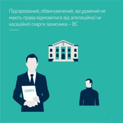 Отже, право відмови від апеляційної чи касаційної скарги захисника, поданої в інтересах підозрюваного, обвинуваченого чи засудженого, належить виключно тій особі, яка її подала, тобто захиснику. Підозрюваний, обвинувачений, засуджений не мають права відмовитися від апеляційної чи касаційної скарги захисника.