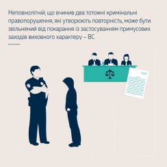 Стаття 105 КК України не містить заборони щодо використання інституту звільнення від покарання із застосуванням примусових заходів виховного характеру в разі вчинення неповнолітнім двох аналогічних кримінальних правопорушень невеликої або середньої тяжкості, які утворюють повторність.
