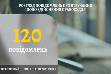 За січень – квітень 2021 року надійшло 105 повідомлень про втручання у професійну діяльність суддів щодо здійснення правосуддя, про дії, що порушують гарантії незалежності суддів або підривають авторитет правосуддя. Розглянуто 120 повідомлень (з урахуванням тих повідомлень, які надійшли за попередні періоди).