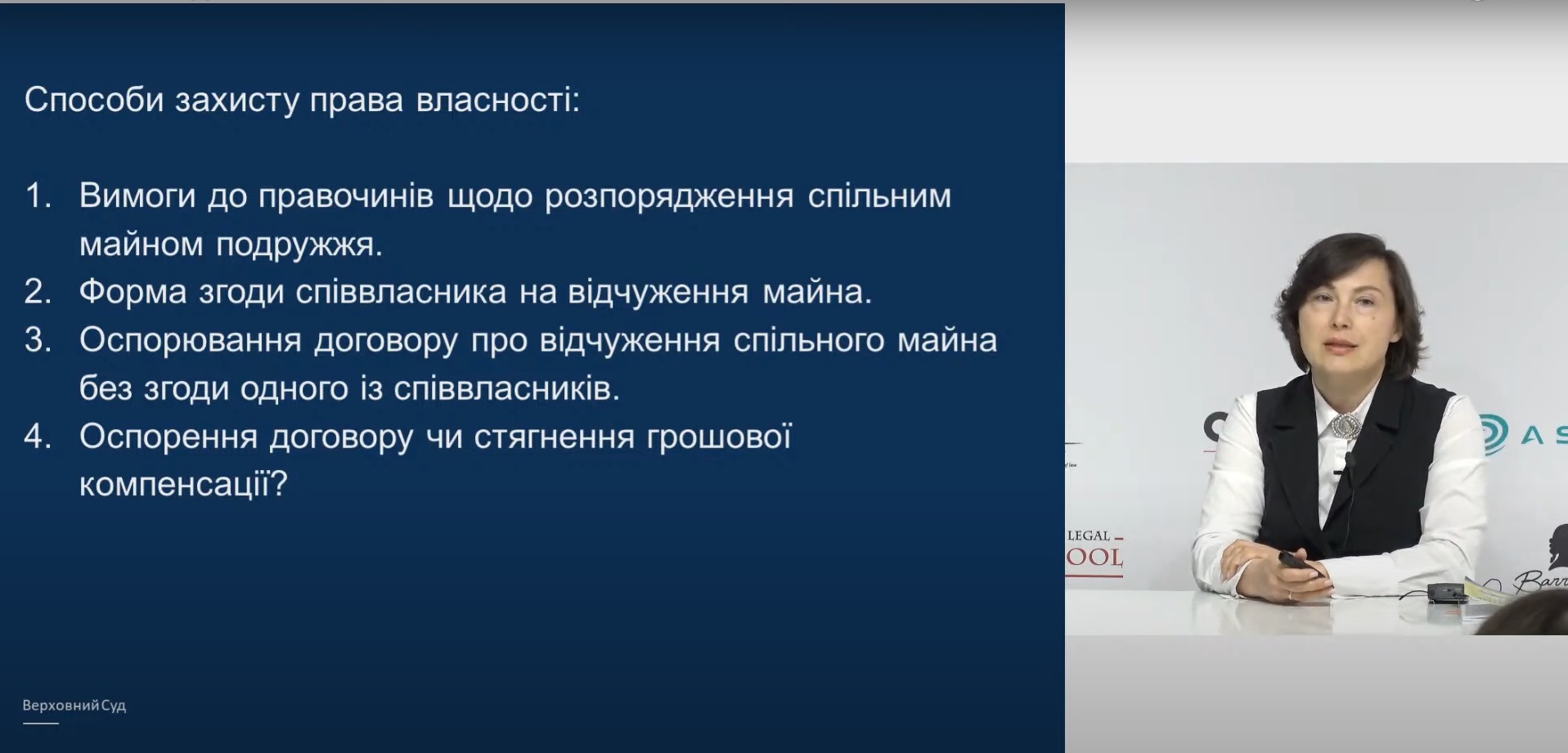 Повертаючись до порушеного на початку лекції питання, Ольга Ступак зазначила, що у спорах, які розглядаються, ефективний спосіб захисту повинна обрати сторона, що звертається до суду за захистом своїх порушених прав. Наприклад, позивач має визначитися, чи потрібно йому оспорювати угоду про відчуження автомобіля, яким він все одно не буде користуватися, чи краще стягнути з відповідача грошову компенсацію за свою частку в такому майні.