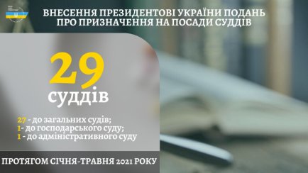 Протягом січня – травня 2021 року Вища рада правосуддя прийняла рішення про внесення Президентові України подання про призначення на посади 29 суддів до місцевих судів: