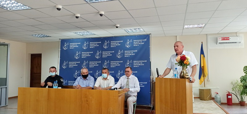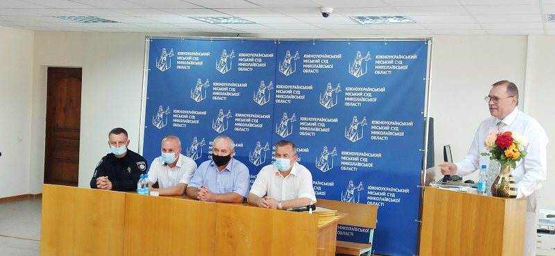 Начальник Територіального управління Служби в Миколаївській області полковник Служби судової охорони Сергій Драчевський представив колективові судової установи своїх співробітників Служби, які відсьогодні виконуватимуть завдання з охорони і забезпечення безпеки суду.