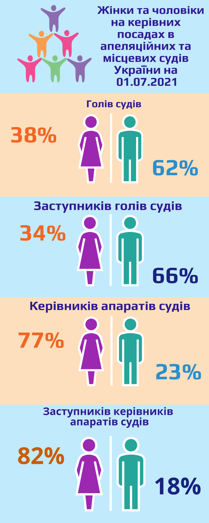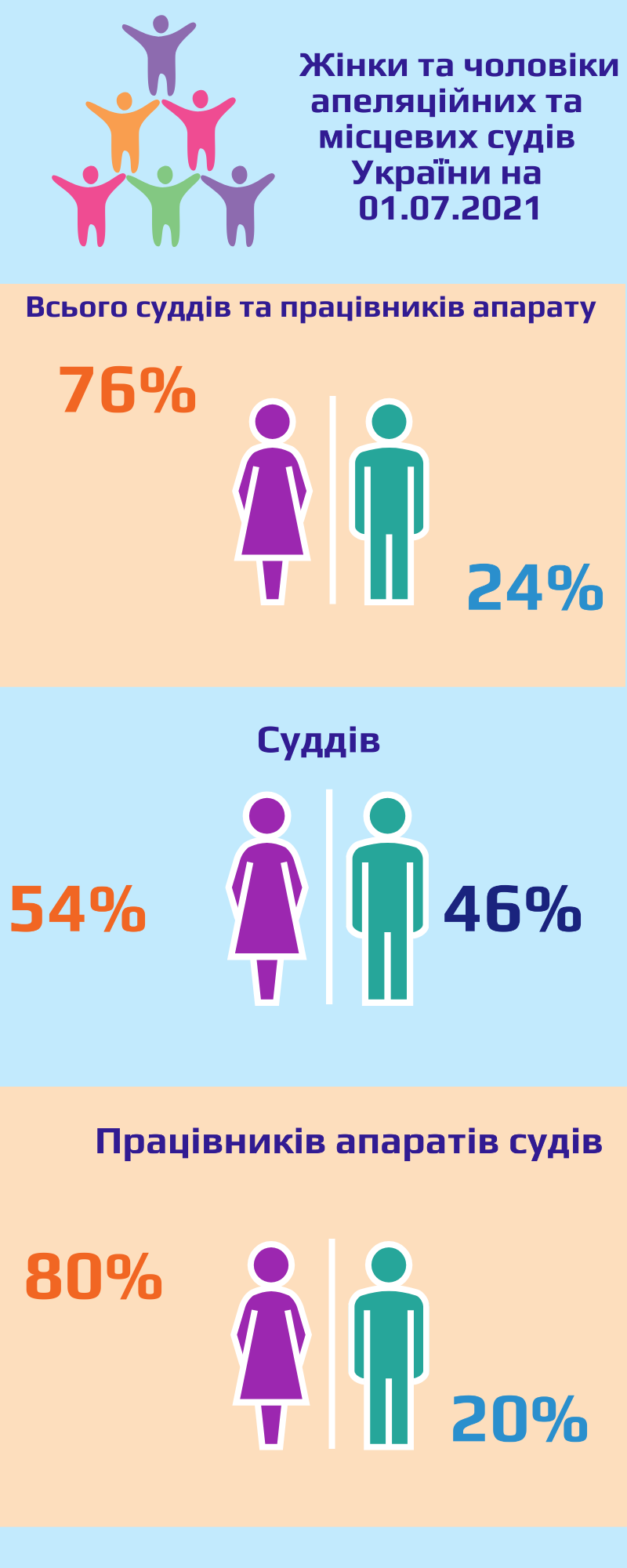 Державна судова адміністрація України на підставі інформації з програми "Кадри WEB" здійснила узагальнення ґендерного складу апеляційних та місцевих судів України, Державної судової адміністрації України та її територіальних управлінь станом на 1 липня 2021 року, що розміщено на офіційному сайті ДСА України в окремій підрубриці "Питання ґендерної рівності".