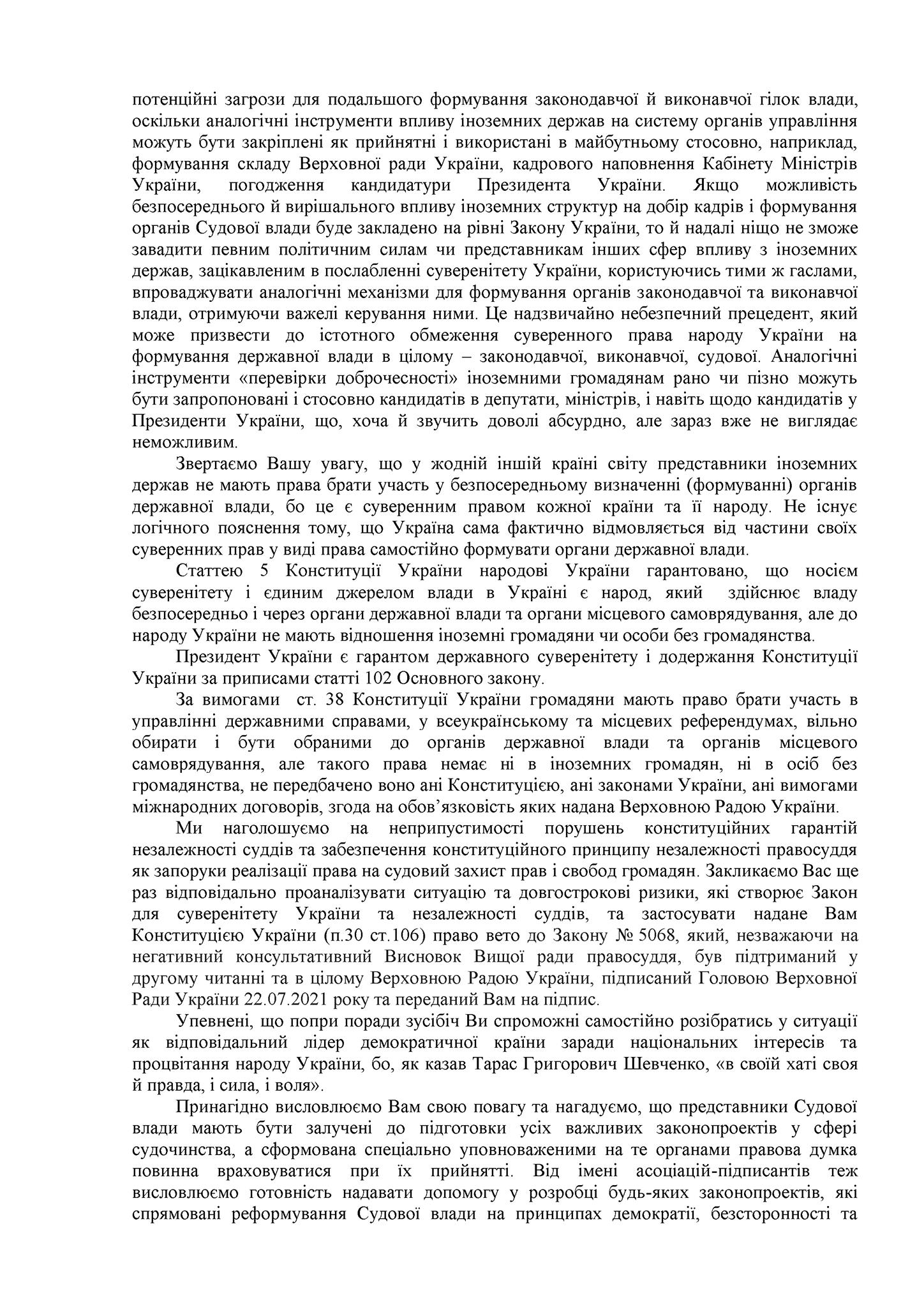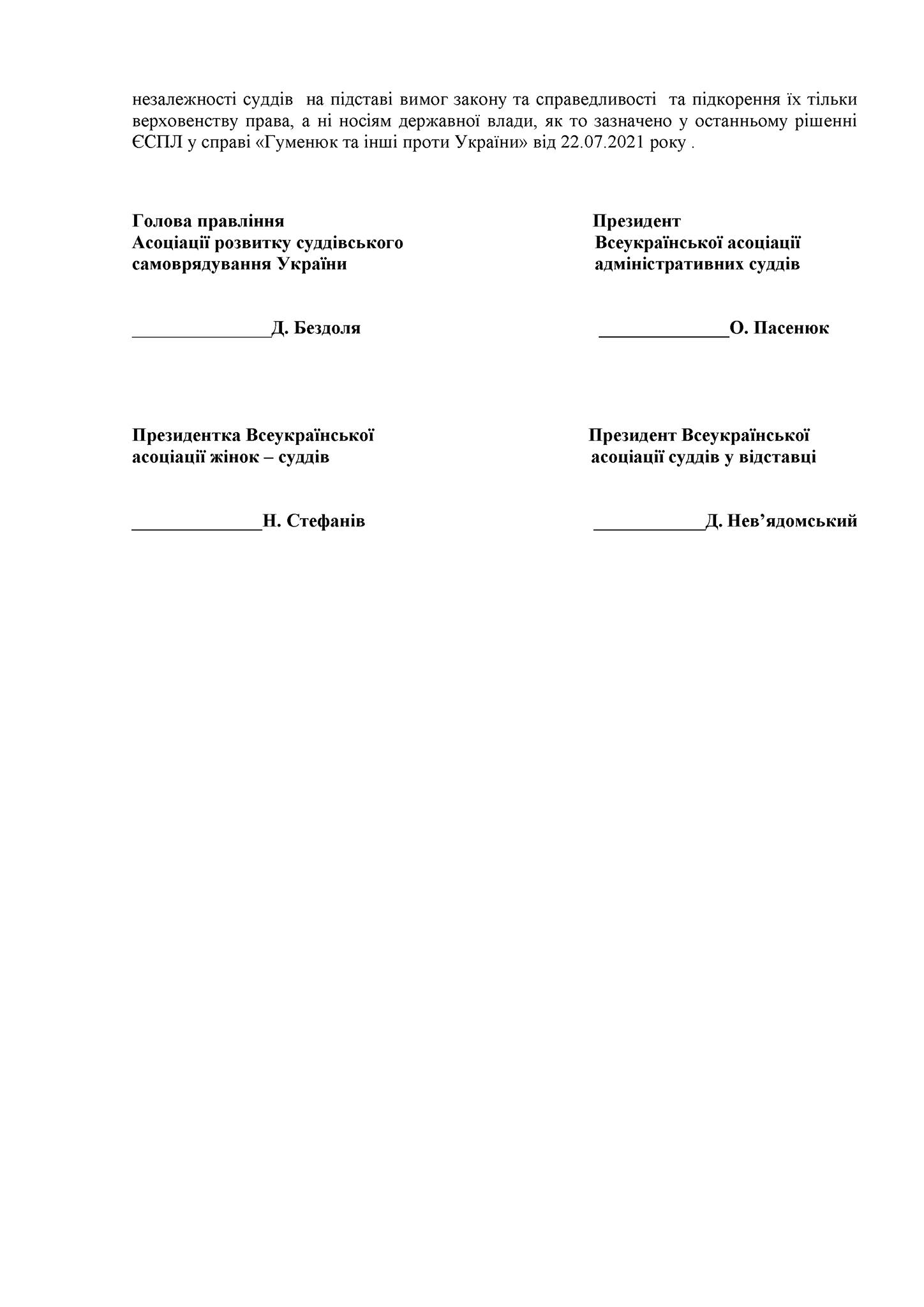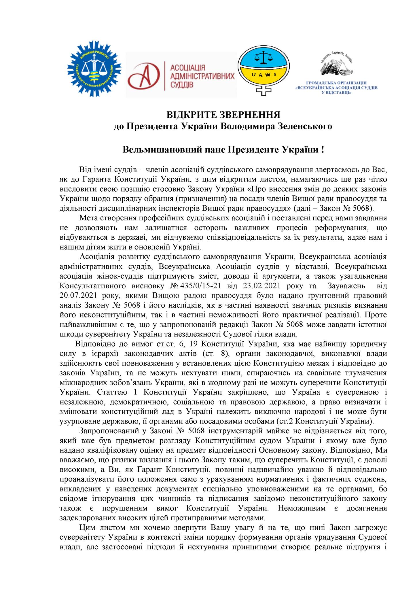 Спільне відкрите звернення Асоціації розвитку суддівського самоврядування України, Всеукраїнської асоціації адміністративних суддів, Всеукраїнської асоціації жінок - суддів та Всеукраїнської асоціації суддів у відставці до Президента України Володимира Зеленського.