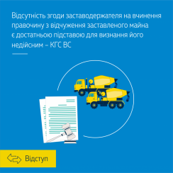 Отже, КГС ВС визнав за необхідне відступити від висновку щодо застосування норм права в подібних правовідносинах, викладеного в постанові КГС ВС від 05.02.2019 у справі № 910/9131/16, оскільки сама по собі відсутність згоди заставодержателя на вчинення правочину з відчуження заставленого майна є достатньою підставою для задоволення позову заставодержателя про визнання такого правочину недійсним.