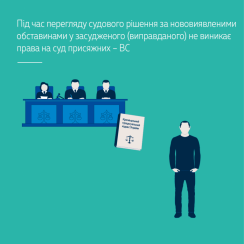 Предметом судового розгляду в порядку провадження за нововиявленими обставинами виступає не обвинувальний акт, а судове рішення, зокрема вирок суду, що набрав законної сили, яким установлено наявність чи відсутність винуватості особи у вчиненні інкримінованого їй злочину. Після набрання вироком законної сили особа, щодо якої здійснюється кримінальне провадження, вже не має статусу обвинуваченого, натомість залежно від прийнятого судом рішення вважається виправданою або засудженою. Забезпечення додаткових гарантій для такої особи у виді перегляду вироку щодо неї за нововиявленими обставинами судом присяжних процесуальний закон не передбачає.