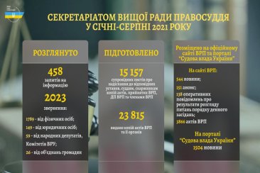 Протягом січня – серпня 2021 року секретаріатом Вищої ради правосуддя розглянуто 2023 звернення: 1789 – від фізичних осіб, 149 – від юридичних осіб, 59 – від народних депутатів України та комітетів Верховної Ради України, 26 – від об’єднань громадян, а також 458 запитів на інформацію.