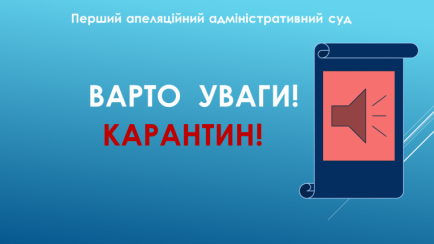 З метою запобігання поширенню гострої респіраторної хвороби COVID-19, Перший апеляційний адміністративний суд звертаємося з проханням у період дії карантину користуватися електронним форматом доступу до судочинства, можливістю участі у розгляді судових справ за допомогою відеоконференцзв'язку та утриматися від участі у судових засіданнях, якщо слухання не передбачають вашої обов'язкової присутності.