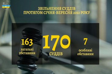 За аналогічний період 2020 року звільнено 212 суддів: за загальними обставинами звільнено 189 суддів (188 – у зв’язку з поданням заяви про відставку, 1 – у зв’язку з поданням заяви про звільнення за власним бажанням); за особливими обставинами звільнено 23 суддів (20 – за вчинення істотного дисциплінарного поступку, 3 – внаслідок визнання судді за результатами кваліфікаційного оцінювання таким, що не відповідає займаній посаді).