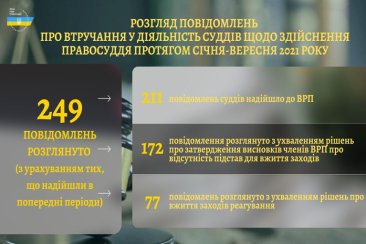Із початку року до ВРП надійшло 211 повідомлень про втручання у діяльність суддів щодо здійснення правосуддя та дії, що порушують гарантії незалежності суддів або підривають авторитет правосуддя. З урахуванням повідомлень, які надійшли в попередні періоди, за перші дев’ять місяців 2021 року Рада розглянула 249 повідомлень.