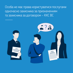 Аналіз чинного законодавства свідчить, що особа не має права користуватися одночасно послугами захисника, з яким уклала договір про надання правової допомоги, та послугами безоплатної правової допомоги, яка надається за рахунок коштів Державного бюджету України, місцевих бюджетів та інших джерел. Тобто особа має право користуватися або послугами захисника за призначенням, або захисника за договором.