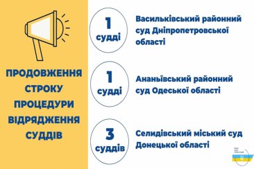 Вища рада правосуддя відповідно до рішень від 2 листопада 2021 року №№ 2152/0/15-21, 2154/0/15-21, 2155/0/15-21 продовжила строк надання суддями згоди на відрядження до Васильківського районного суду Дніпропетровської області, Селидівського міського суду Донецької області, Ананьївського районного суду Одеської області до 12 листопада 2021 року.