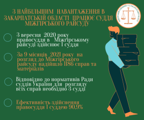 За підсумками дев'яти місяців 2021 року встановлено, що на розгляд до суду надійшло 1186 справ і матеріалів, і це в 1,6 разів більше, ніж в розрахунку на 1 суддю в цілому по Закарпатській області.