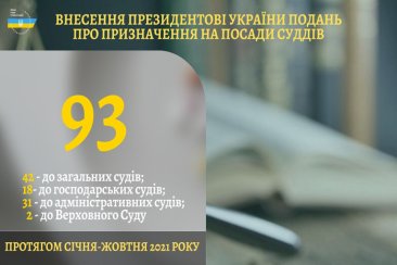 Протягом перших десяти місяців 2021 року Вища рада правосуддя прийняла рішення про внесення Президентові України подання про призначення на посади 93 суддів: