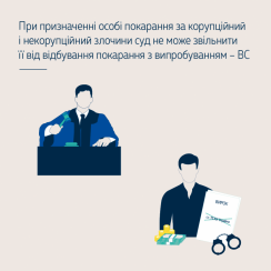 Вчинення особою корупційного кримінального правопорушення унеможливлює звільнення її від відбування покарання з випробуванням (ст. 75 КК України) навіть у разі призначення остаточного покарання за сукупністю кримінальних правопорушень, одне з яких є некорупційним. Тому звільнення особи від відбування остаточного покарання, визначеного за сукупністю кримінальних правопорушень, до якої входило як некорупційне, так і корупційне кримінальне правопорушення, на підставі ст. 75 КК України є неправильним застосуванням закону України про кримінальну відповідальність.