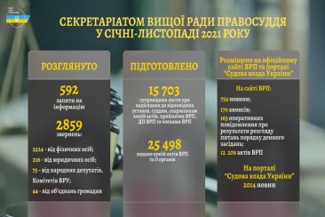 Протягом січня – листопада 2021 року секретаріатом Вищої ради правосуддя розглянуто 2859 звернень: 2524 – від фізичних осіб, 216 – від юридичних осіб, 75 – від народних депутатів України та комітетів Верховної Ради України, 44 – від об’єднань громадян, а також 592 запити на інформацію.