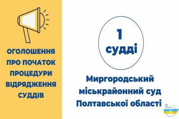 Вища рада правосуддя відповідно до рішення від 7 грудня 2021 року № 2299/0/15-21 оголошує про початок процедури відрядження суддів до іншого суду того самого рівня і спеціалізації для здійснення правосуддя, а саме 1 судді до Миргородського міськрайонного суду Полтавської області.
