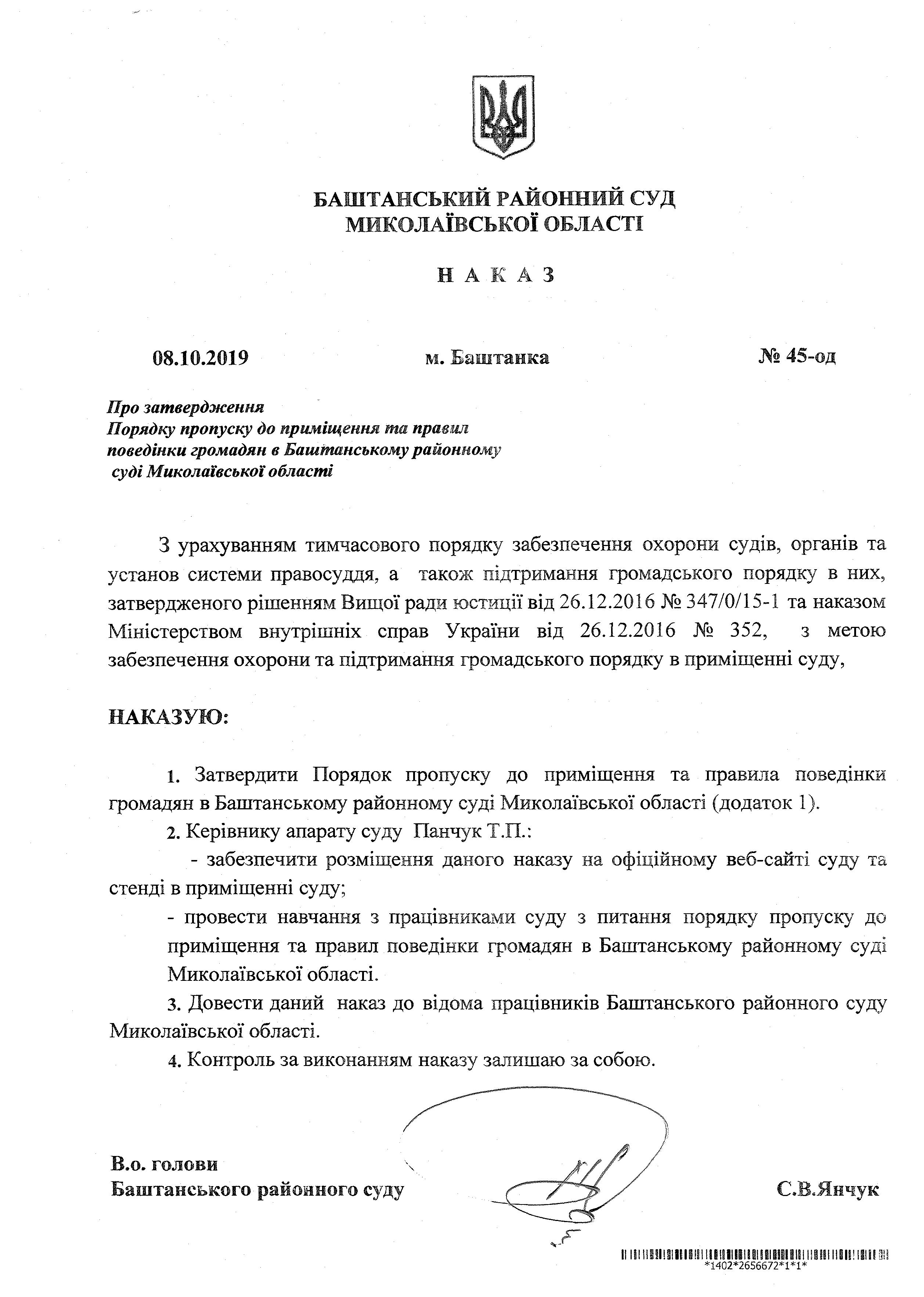 З метою забезпечення охорони та підтримання громадського порядку в приміщенні суду, 8 жовтня 2019 року наказом в.о. голови суду затверджено Порядок пропуску до приміщення та правила поведінки громадян в Баштанському районному суді Миколаївської області.