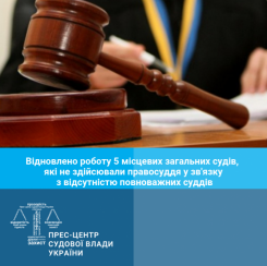 У жовтні відновлено роботу 5 із 16 місцевих загальних судів без повноважних суддів. Завдяки указам Глави держави від 7 жовтня 2019 року 735/2019 та від 17 жовтня 2019 року № 760/2019 про призначення на посади суддів до місцевих загальних судів було, зокрема відновлено роботу 5 із 16 місцевих загальних судів, у яких правосуддя не здійснювалося через відсутність повноважних суддів.