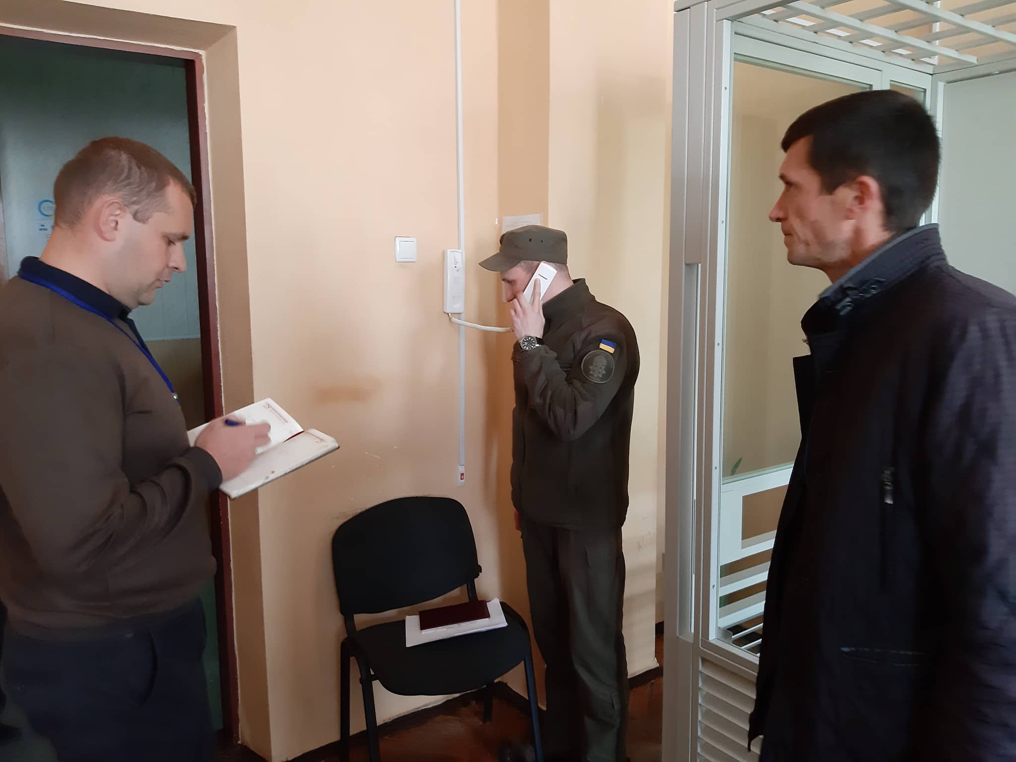 Варто зазначити, що члени комісії практично перевіряли справність технічних засобів охорони суду. Наприклад, натиснувши в залі судового засідання на тривожну кнопку, одразу, в межах хвилини, до зали, з перевіркою, зайшли військовослужбовці з посту охорони.
