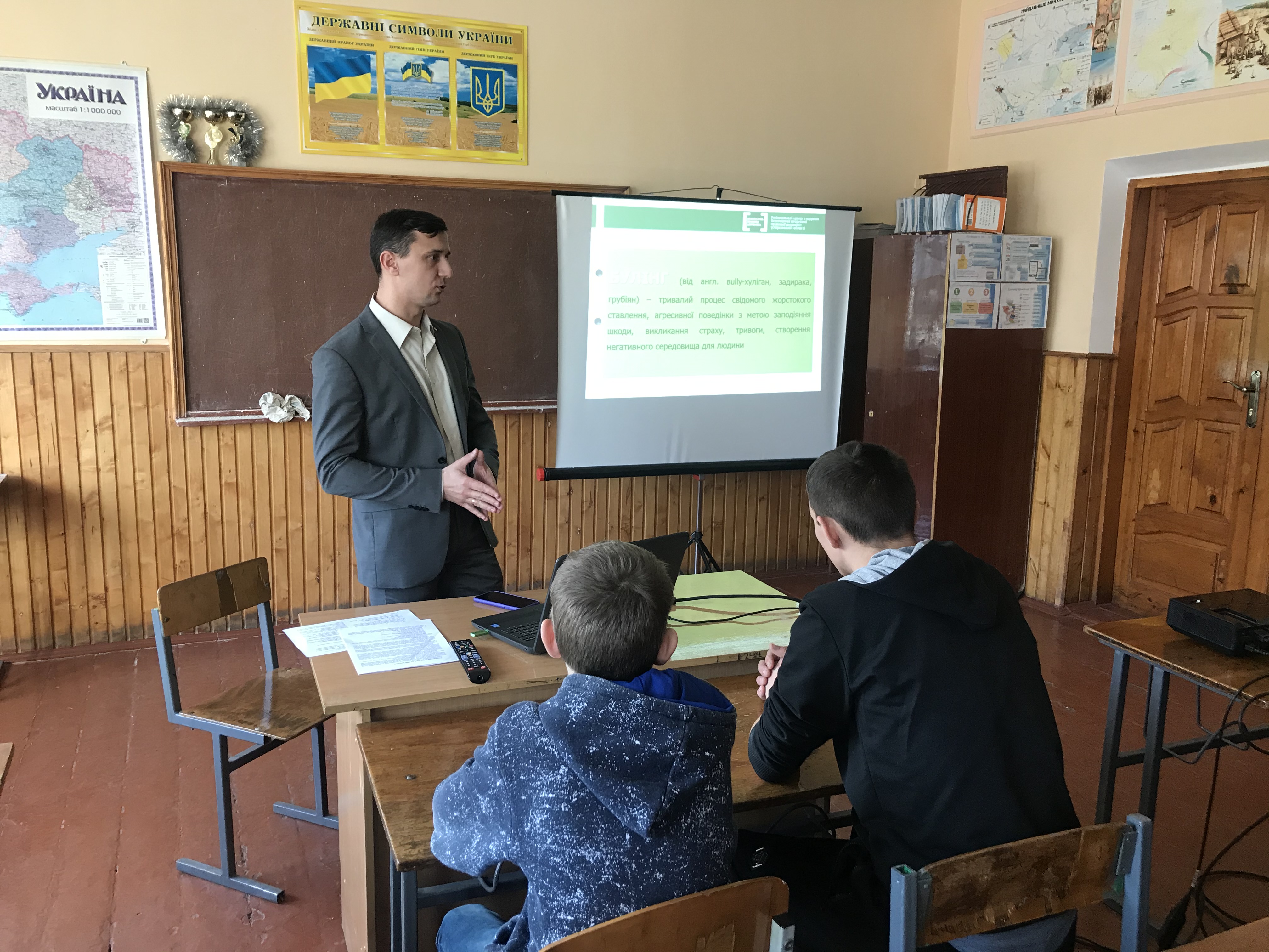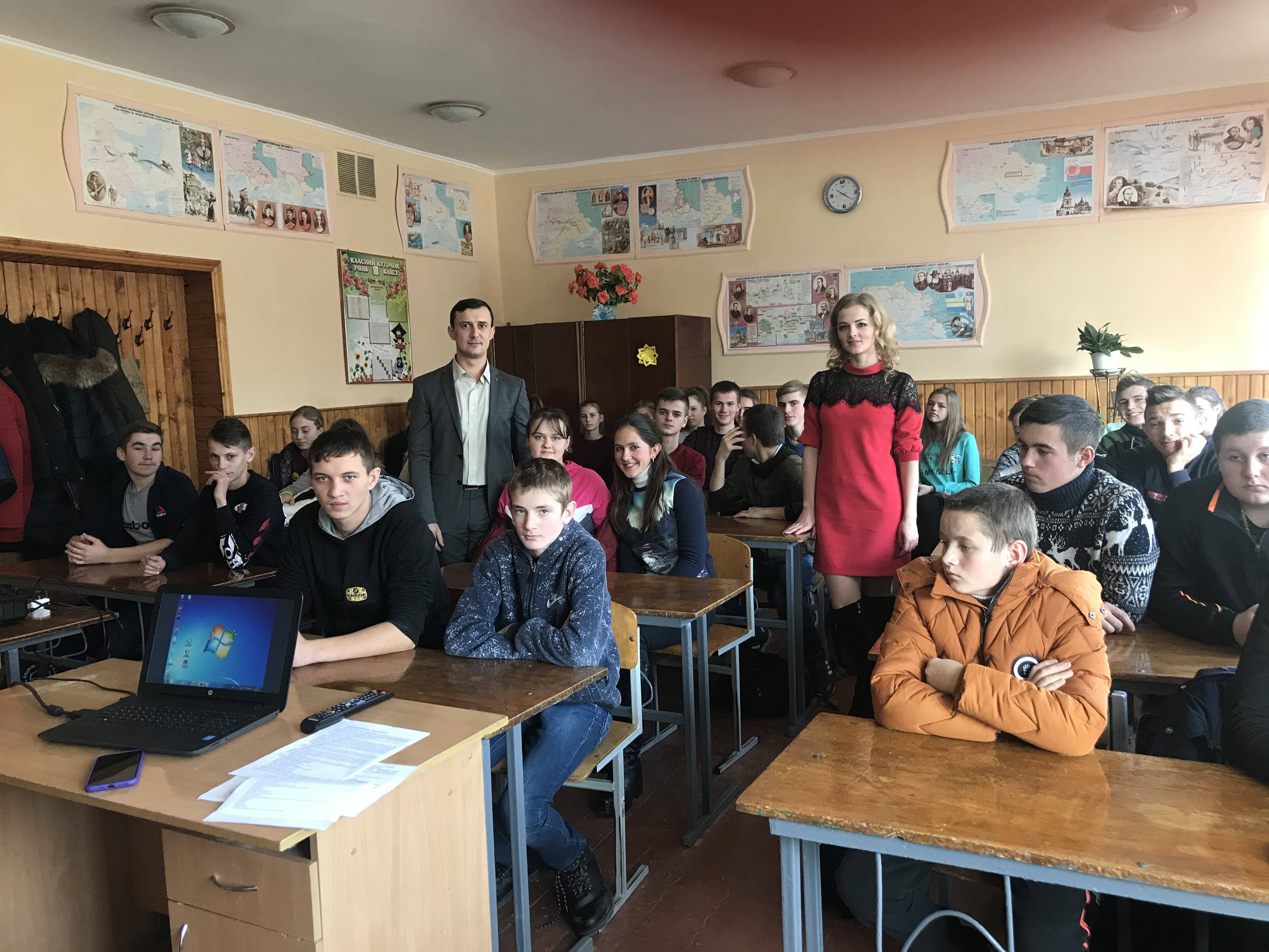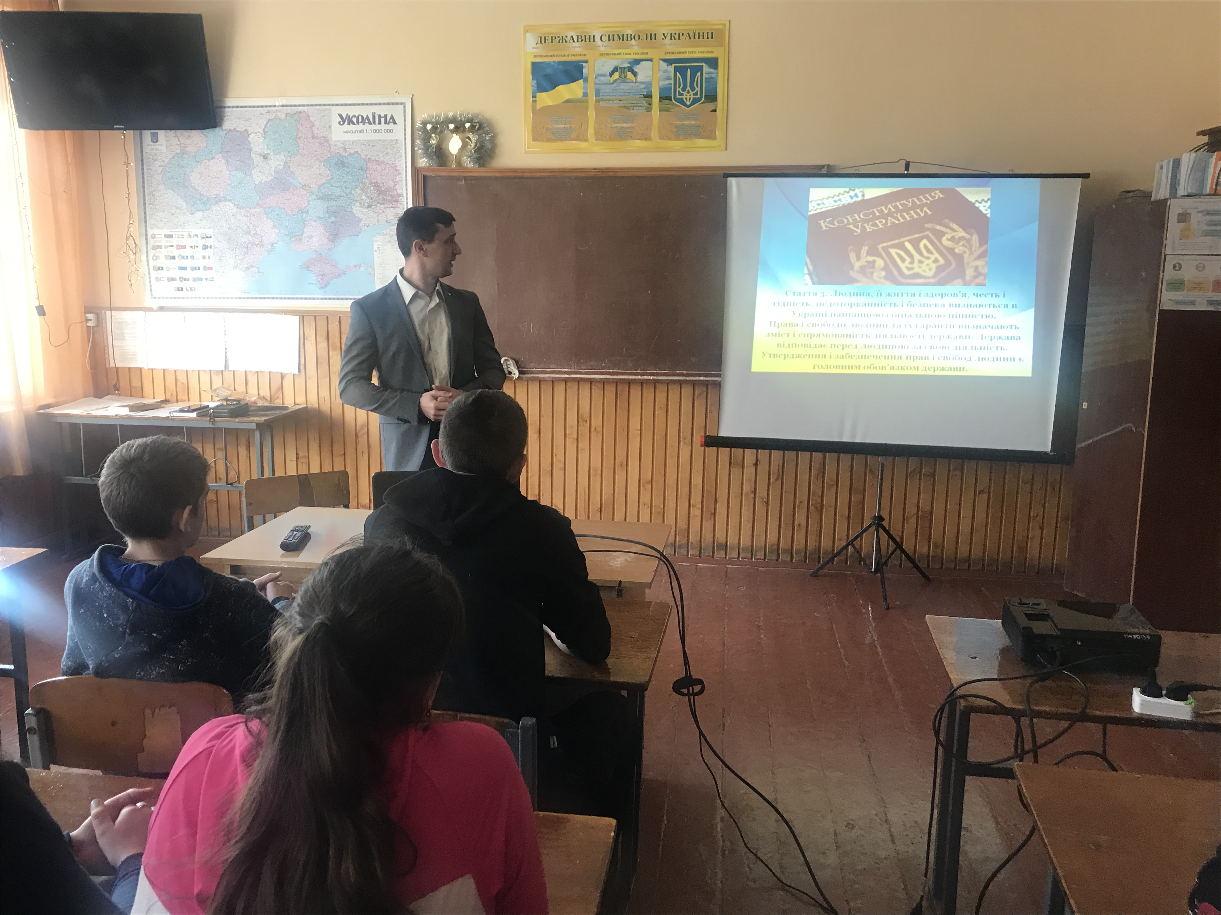 З метою формування у школярів правової культури громадянина України, що складається передусім зі свідомого ставлення до своїх прав і обов'язків перед суспільством і державою, закріплених у Конституції України, з глибокої поваги до законів і правил людського співжиття, готовності дотримуватися й виконувати закріплені в них вимоги до школи завітали представники суду: керівник апарату Калинівського районного суду Вінницької області Анатолій Дудар та консультант суду Олена Пророк.