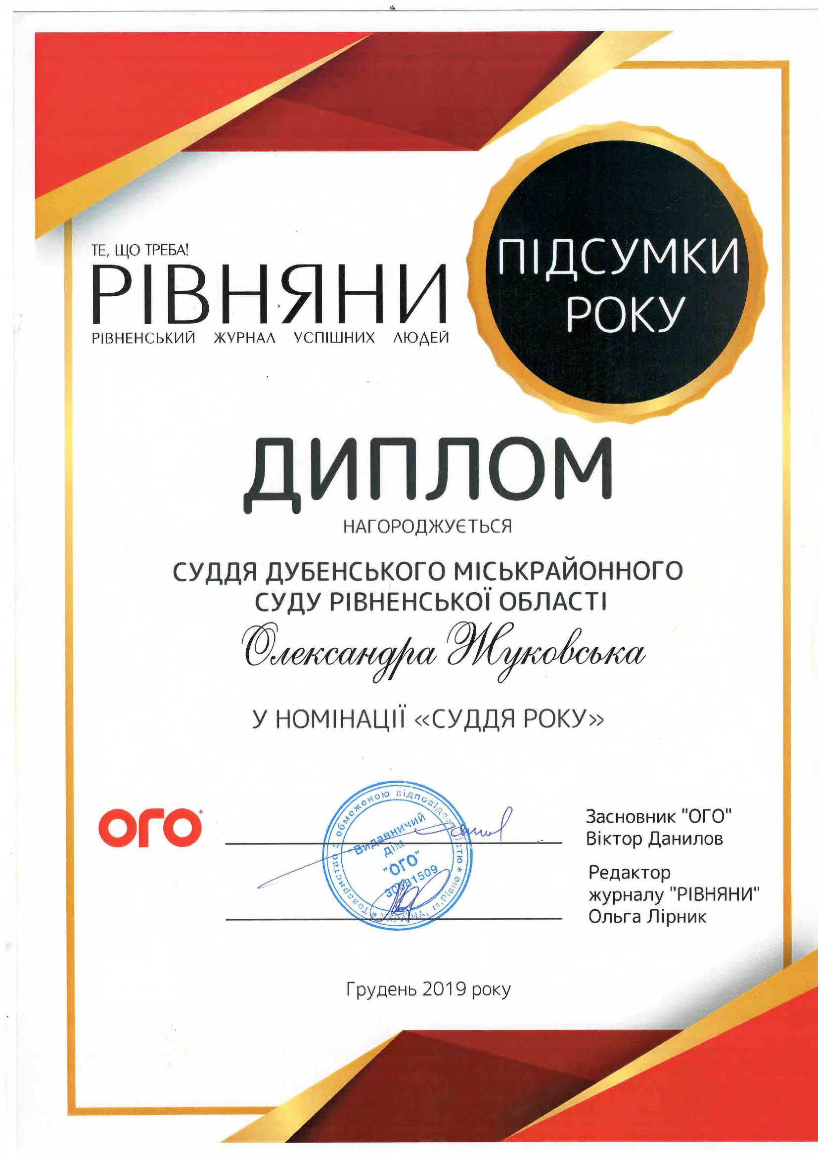 За версією журналу «Рівняни» Видавничого дому «Ого» суддю Дубенського міськрайонного суду Рівненської області Олександру Жуковську визнано "Суддею року".