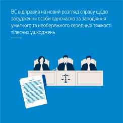 Колегія суддів Першої судової палати Касаційного кримінального суду у складі Верховного Суду задовольнила касаційну скаргу прокурора на ухвалу апеляційного суду, згідно з якою вирок місцевого суду щодо засудження особи за ч. 1 ст. 122 (умисне середньої тяжкості тілесне ушкодження) та за ст. 128 (необережне середньої тяжкості тілесне ушкодження) КК України був залишений без змін.