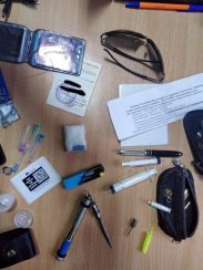 Співробітники Служби ретельно перевірили чоловіка та виявили в нього пластикову колбу і згорток з невідомою білою речовиною, а також медичні шприци.