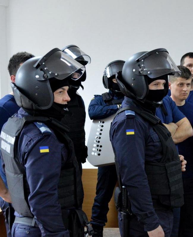 На навчаннях співробітники Служби відпрацювали практичні навички тактичних дій у разі порушень громадського порядку під час судових засідань.