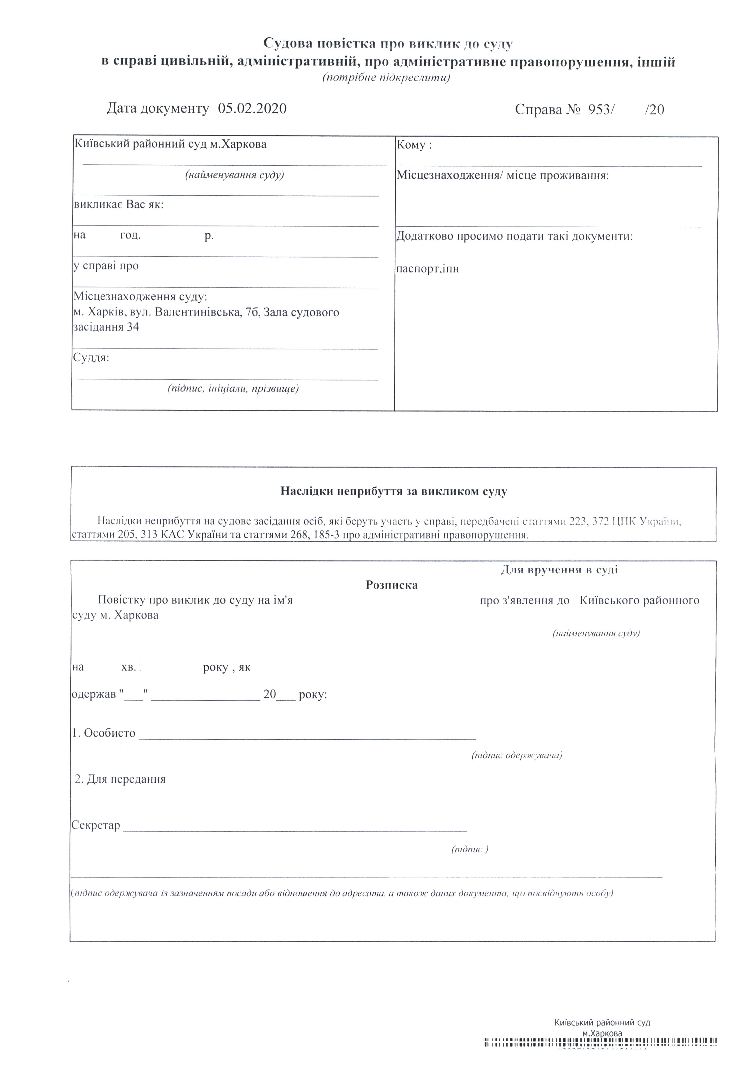 Київський районний суд міста Харкова звертає увагу на те, що останнім часом почастішали випадки надсилання громадянам фальшивих судових повісток про виклик до суду.