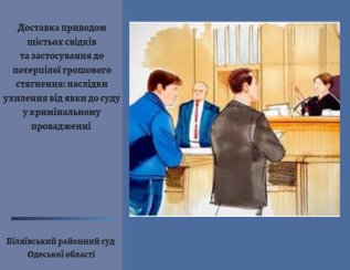 12 лютого 2020 року Біляївським районним судом Одеської області у складі двох професійних суддів та трьох присяжних задоволено клопотання прокурора про доставку приводом на 20 лютого 2020 року на 10:00 до Біляївського районного суду Одеської області шістьох свідків, які ухиляються від явки до суду та застосовано до потерпілої грошове стягнення у розмірі 0,5 прожиткового мінімуму для працездатних осіб, тобто 1051 грн., яка будучи належним чином сповіщеною про необхідність явки в судове засідання, на виклики не з’являється (обговорення питання про застосування до потерпілої грошового стягнення відбулося за ініціативою суду).