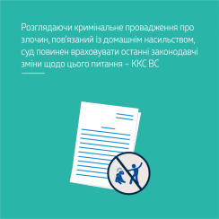 ККС ВС також вказав, що Законом України «Про внесення змін до Кримінального та Кримінального процесуального кодексів України з метою реалізації положень Конвенції Ради Європи про запобігання насильству стосовно жінок і домашньому насильству та боротьбу з цими явищами» ч. 1 ст. 67 КК України було доповнено п. 6-1. Відповідно до цього пункту обставиною, що обтяжує покарання, є вчинення злочину щодо подружжя чи колишнього подружжя або іншої особи, з якою винний перебуває (перебував) у сімейних або близьких відносинах.