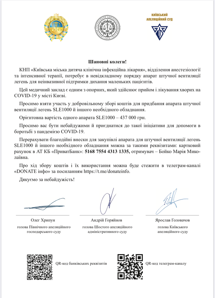 Судді міста Києва, Київської, Черкаської, Чернігівської, Сумської областей проводять благодній збір коштів для придбання апарата штучної вентиляції легень SLE1000 й іншого необхідного обладнання.