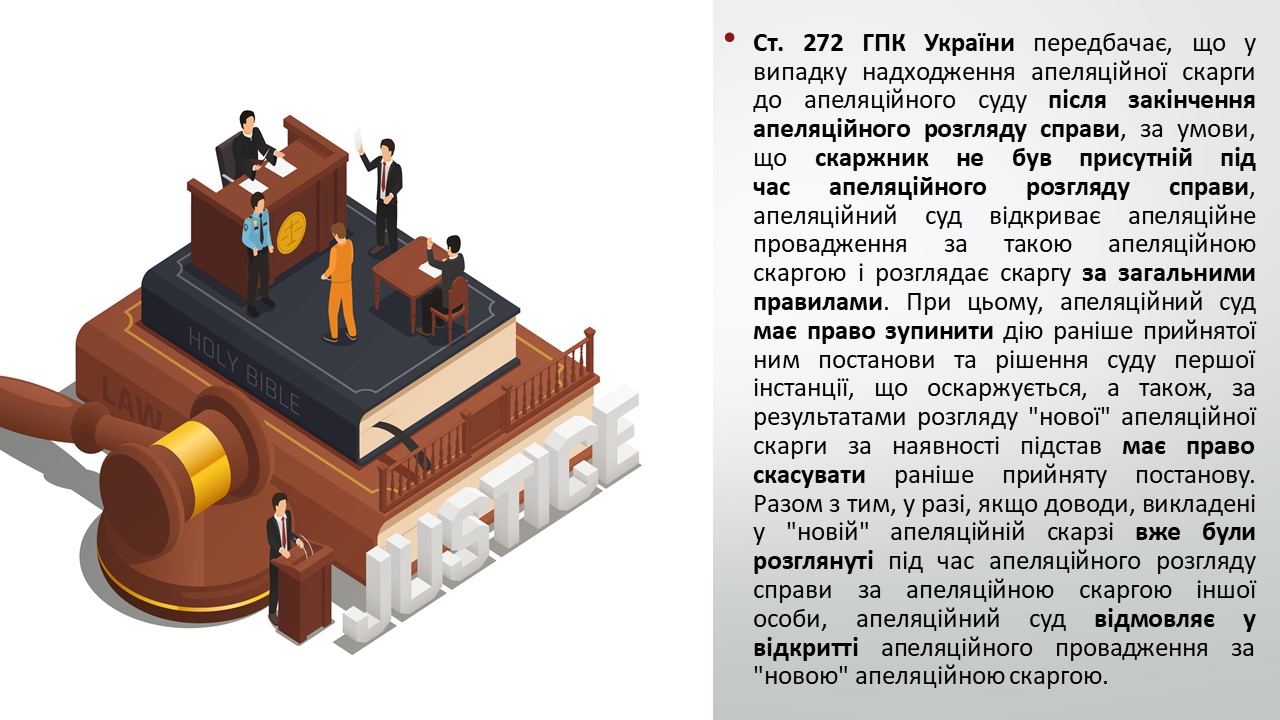 Можливість розгляду апеляційної скарги, що надійшла після закінчення апеляційного перегляду справи, є доволі новим процесуальним інститутом, тому наразі його застосування у судовій практиці інколи викликає труднощі не тільки у сторін судового спору, але і у суддів.