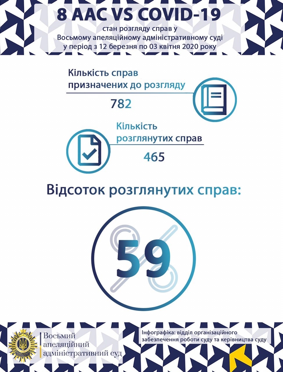Восьмий ААС забезпечує здійснення апеляційного перегляду адміністративних справ під час карантину: з 12 березня по 3 квітня 2020 року було розглянуто 59% призначених справ. Розгляд інших справ не було завершено у зв’язку із встановленням на території України карантину та через інші поважні причини. Детальніше на інфографіці нижче.