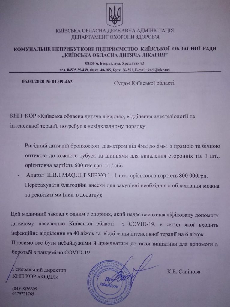 Судді Ірпінського міського суду Київської області приєдналися до ініціативи допомогти в боротьбі з пандемією COVID-19 та проявили активну участь у наданні допомоги КНП КОР «Київська обласна дитяча лікарня», відділенню анестезіології та інтенсивної терапії для придбання життєво необхідного обладнання - ригідного дитячого бронхоскопу та апарату штучної вентиляції легень.