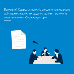 Суд також зазначив, що з огляду на положення цього Закону, які визначають юридичний статус і повноваження арбітражного керуючого щодо скликання зборів кредиторів та організації їх проведення (ч. 3 ст. 22), а також на положення п. 23 розд. IІ Правил організації діловодства та архіву арбітражного керуючого (розпорядника майна, керуючого санацією, ліквідатора) та Вимоги до оформлювання документів (п. 5.21) складення протоколів є логічним завершальним етапом фіксування прийняття за результатами обговорення на зборах кредиторів рішення, яке приймається шляхом голосування та відповідного оформлення результатів голосування.