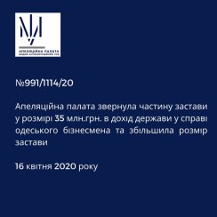 16 квітня 2020 року Апеляційна палата Вищого антикорупційного суду розглянула апеляційну скаргу прокурора у справі одеського бізнесмена (№991/1114/20) на ухвалу слідчого судді Вищого антикорупційного суду від 18 березня 2020 року щодо відмови у задоволенні клопотання про звернення застави в дохід держави і збільшення підозрюваному розміру застави.